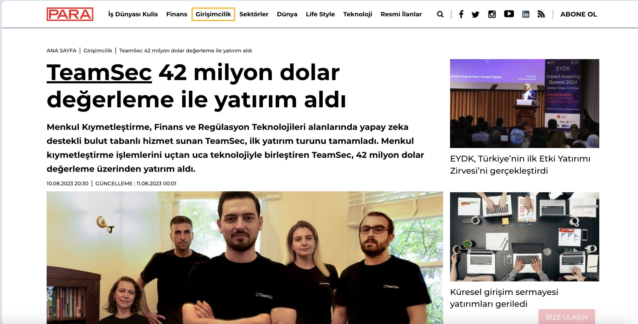 "TeamSec 42 Milyon Değerleme Üzerinden Yatırım Aldı" Haberi Para Dergi'de!