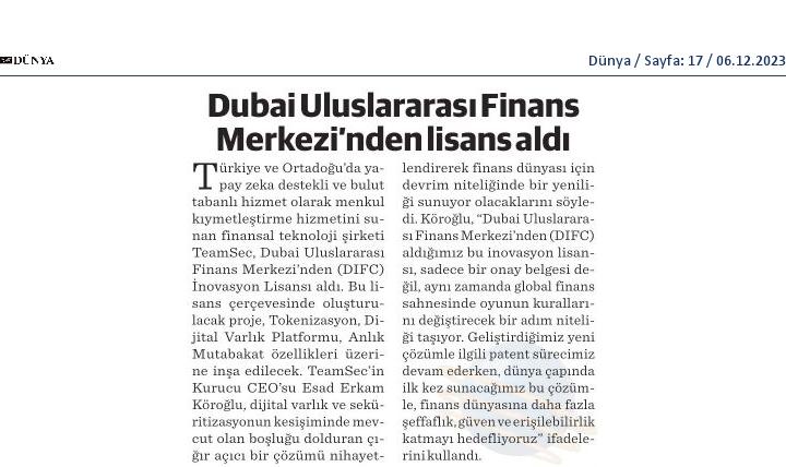 "TeamSec, Dubai Uluslararası Finans Merkezi'nden İnovasyon Lisansı aldı" haberi yerel ve ulusal medya kuruluşları ve web siteleri tarafından haberleştirilmeye devam ediyor. Haber detaylarını Dünya Gazetesi'nde bulabilirsiniz.