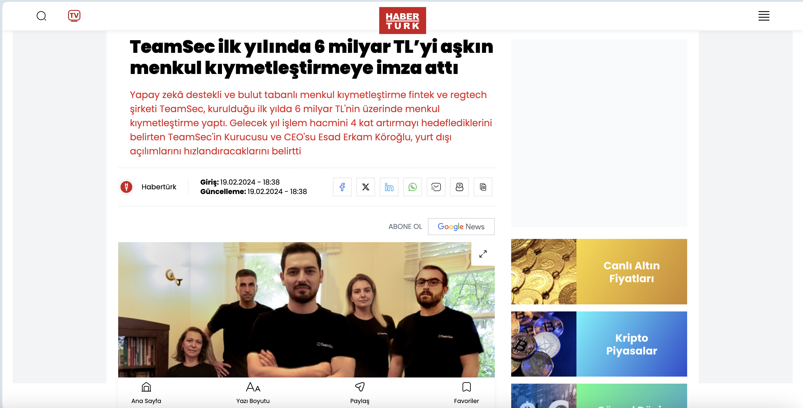 "TeamSec, İlk Yılında 6 Milyar TL'yi Aşkın Menkul Kıymetleştirmeye İmza Attı" haberi yerel ve ulusal medya kuruluşları ve web siteleri tarafından haberleştirilmeye devam ediyor. Haber detaylarını Habertürk Gazetesi'nde bulabilirsiniz.