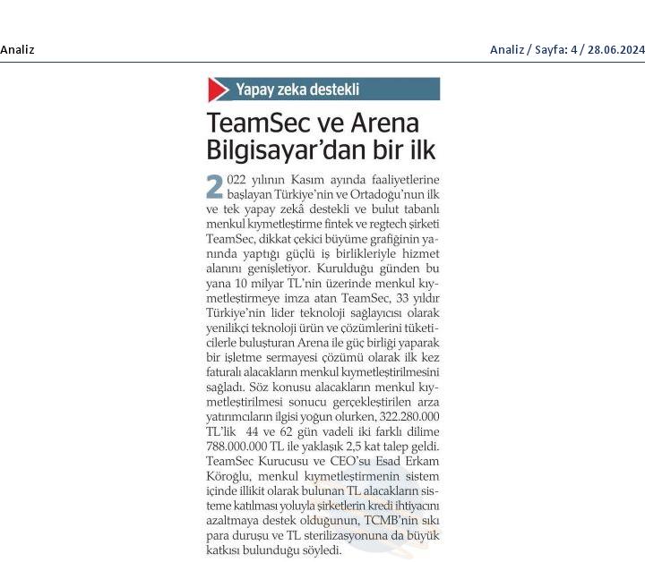 Türkiye’nin tek yapay zekâ destekli ve bulut tabanlı menkul kıymetleştirme fintek ve regtech şirketi TeamSec, alanında ilklere imza atmaya devam ediyor. TeamSec ve Türkiye’nin lider teknoloji sağlayıcısı Arena arasında imzalanan anlaşmayla ilk kez bir işletme sermayesi çözümü olarak faturalı alacakların menkul kıymetleştirilmesi sağlandı. Gerçekleştirilen arza 2,5 kat talep geldi.